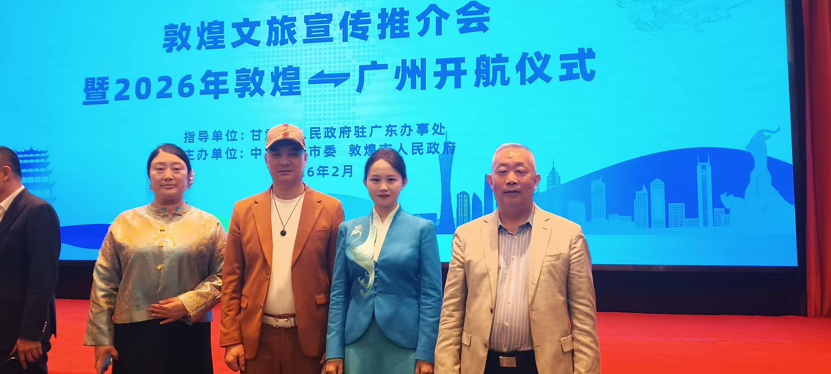 马年伊始,深圳胡蝶文化产业发展有限公司基地受甘肃驻广东办事处、深圳航空协会低空经济委员会、中国地标一县一品深圳选品基地特邀,参加了丙午马年初十由甘肃省敦煌市委、市政府在广州东方宾馆举行的以“品千年莫高,游盛世敦煌”为主题的敦煌文旅推介会暨2026敦煌—广州航线开航仪式发布会。