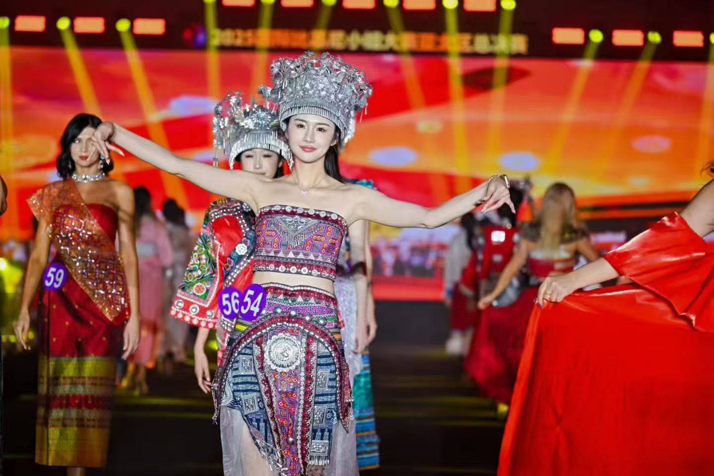 60位入围选手身着56个民族服饰,以爱我中华的歌声为背景音乐,在国际T台上向全球展示中华民族大家庭的风采。