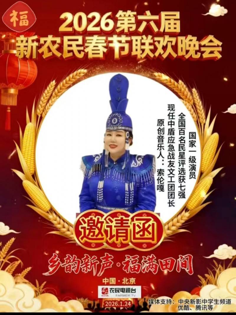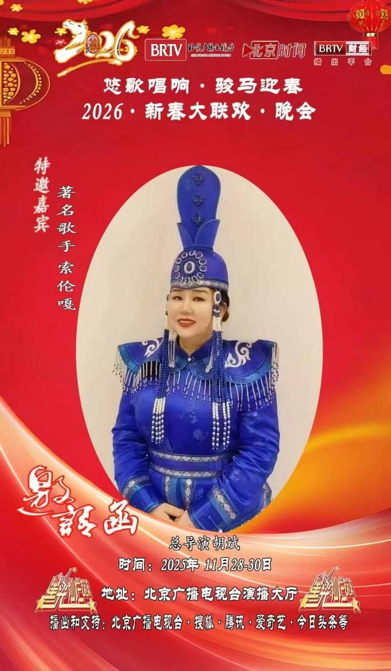 据悉,索伦嘎以精湛唱功与广泛影响力,2026年春节期间,受邀录制广西卫视多个省台春晚、中国教育台春晚,中国国际教育台春晚,央视多个频道主题春晚,北京首钢春晚 央视爱在天地间明星春节联欢晚会,金砖国家文化春晚,中央广播电视总台环球奇观频道春晚,农民春晚,中华母亲春晚,内蒙古政协春节联谊晚会,呼伦贝尔春晚,四子王旗春晚等,一共受邀参加了17台春节联欢晚会。节目登陆甘肃卫视,海南卫视,黑龙江卫视,春晚华尔街卫视、环球卫视、央视频等海内外权威平台同步播出,形成跨地域、全媒体的新春文艺传播矩阵,收获海内外观众与业界高度赞誉。