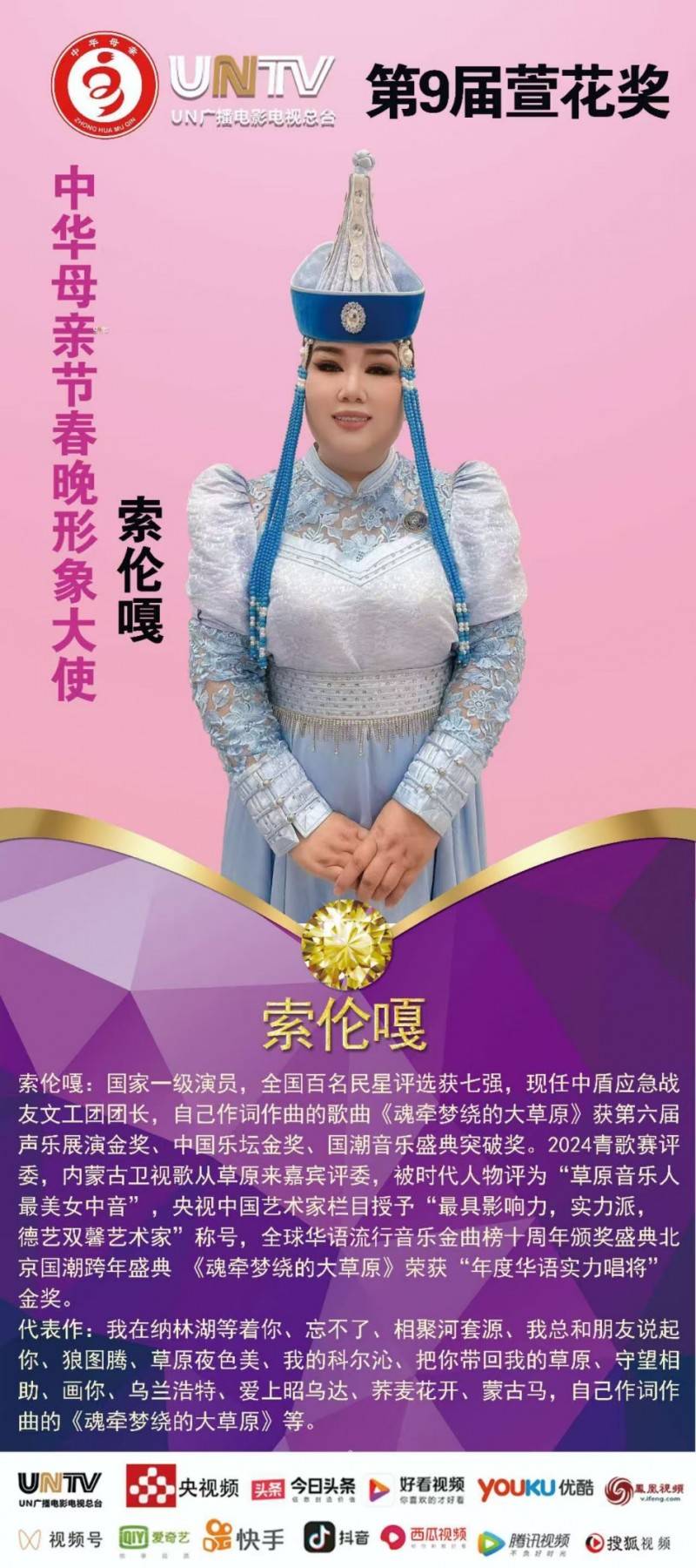 作为来自科尔沁草原的实力派歌唱家,索伦嘎深耕民族声乐领域,师从德德玛、阿拉泰、齐·宝力高等声乐名家,被誉为“最美女中音”,嗓音醇厚温润、音色饱满、极具感染力与辨识度,擅长民族与通俗融合演唱,舞台风格大气端庄、情感真挚。